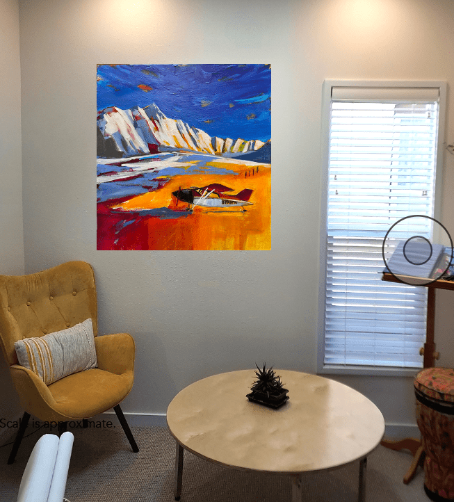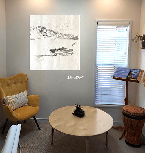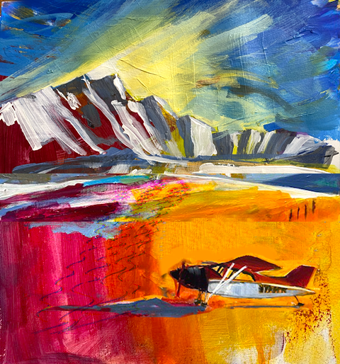 She wanted a colorful painting that would include Bill’s plane with the four friends hiking up and their ski tracks visible in the snow.