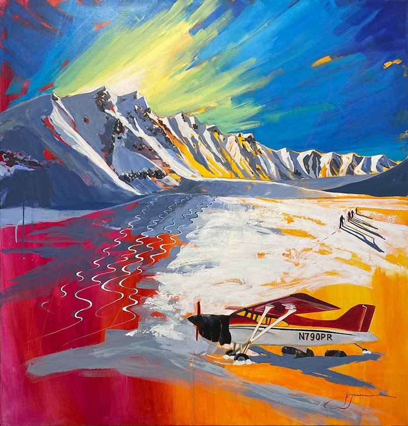 She wanted a colorful painting that would include Bill's plane with the four friends hiking up and their ski tracks visible in the snow.