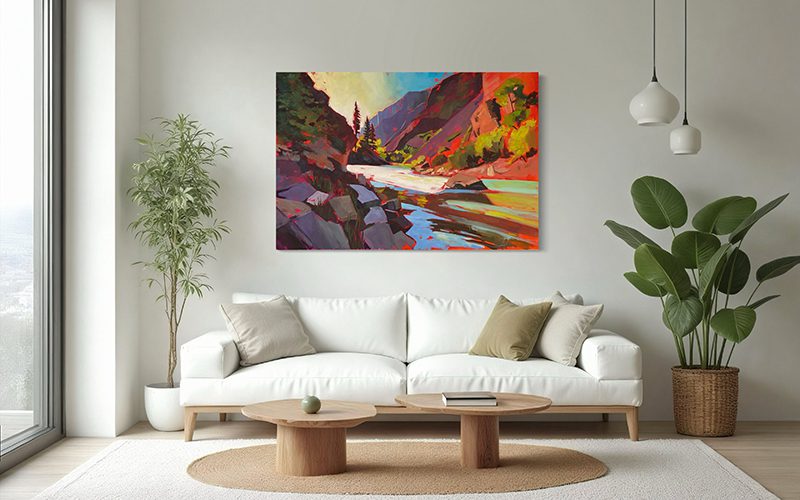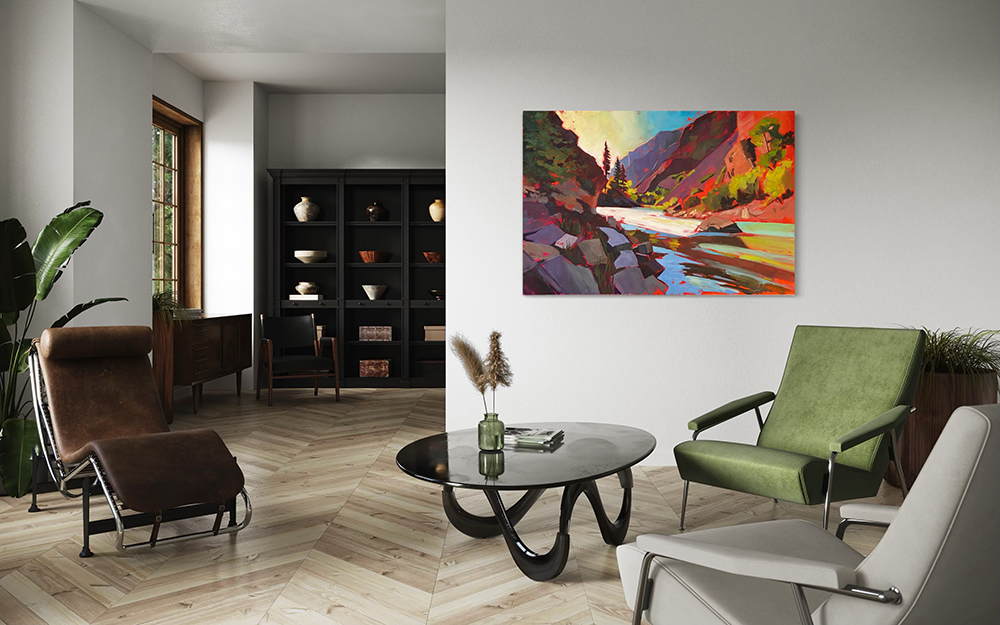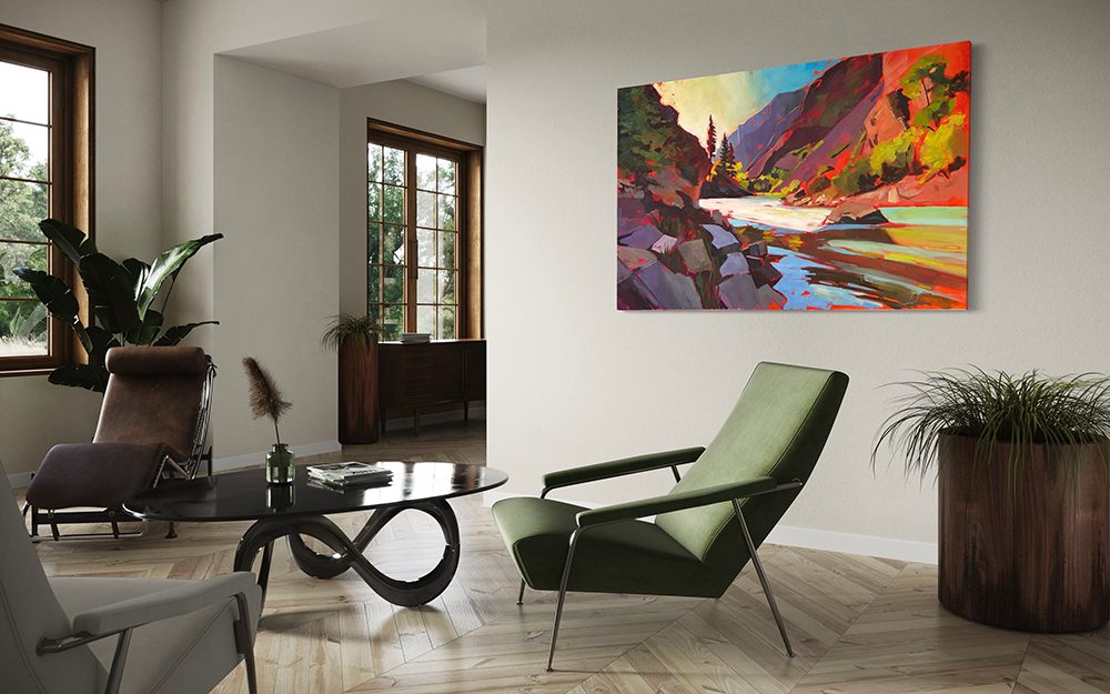 I visited Black Canyon of the Gunnison a few years back to hike for my birthday and created a painting after. Here’s a new version at 40×60″ size. If you’re looking for an impact piece, this is it. Original acrylic on gallery depth canvas – comes ready to hang with painted sides. ©Leslie Jorgensen