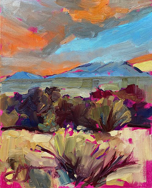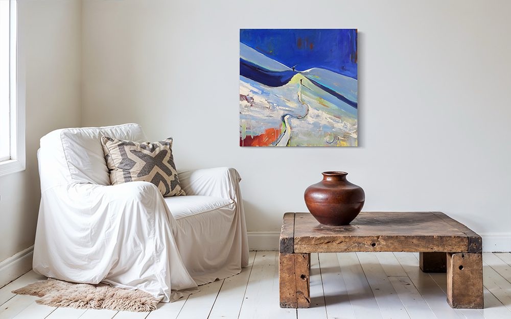 Based on a sunny day in the backcountry bootpacking a ridge. At a nice medium size of 30×30″ this painting is perfect for that little spot near your favorite chair or in a study. Original acrylic painting on gallery-depth canvas. Comes wired and ready to hang. ©Leslie Jorgensen