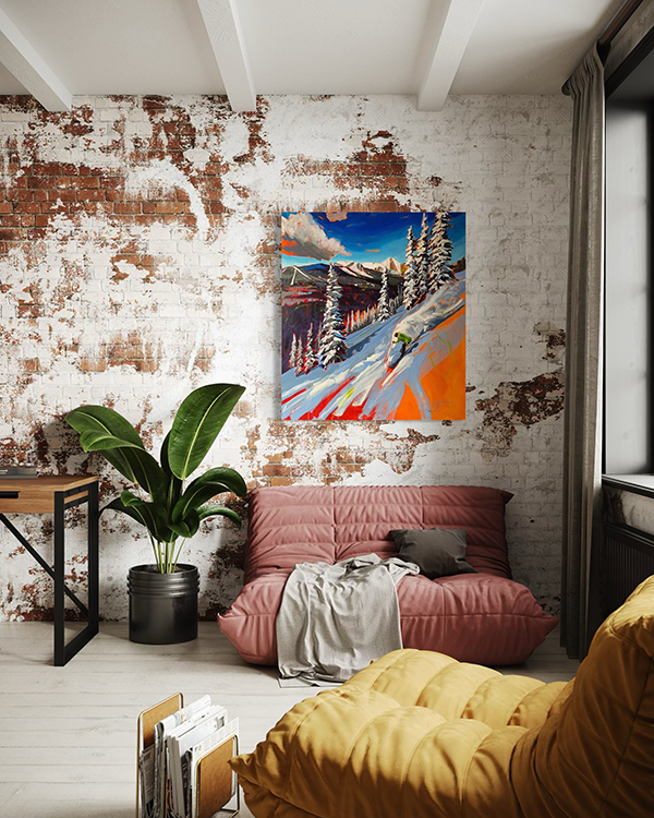 Based on many days skiing locals-favorite Perfect Trees on Monarch Pass. Original painting on reclaimed wood finely finished with 1×2 edges that are painted. Comes wired and ready to hang. ©Leslie Jorgensen