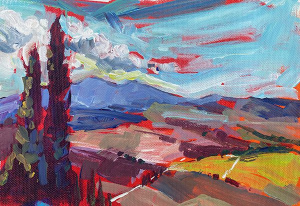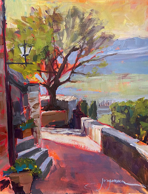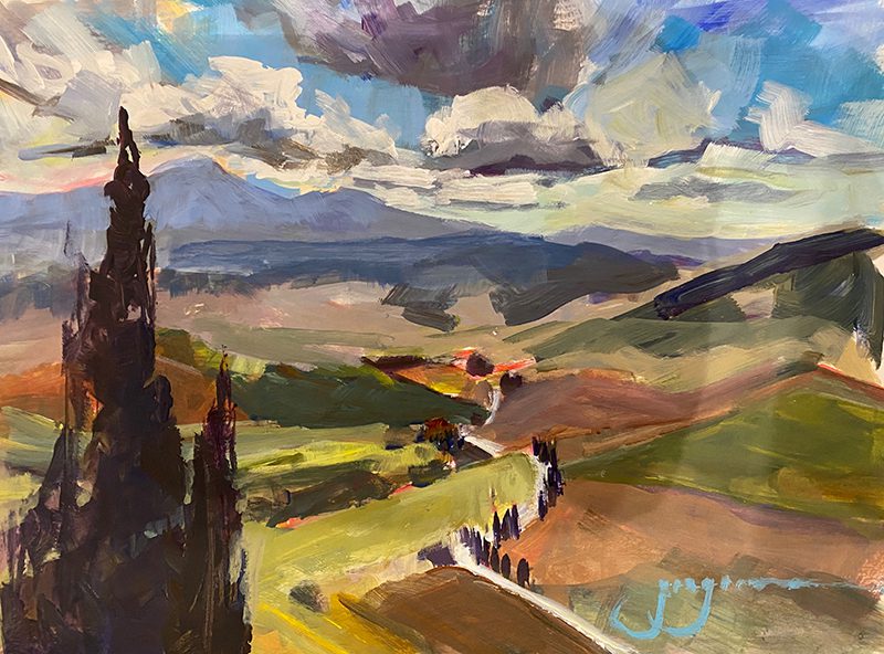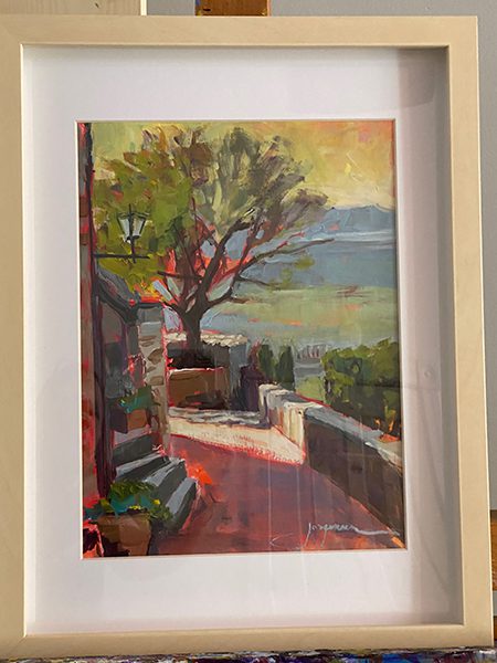 Painted en plein aire in Pienza, Italy. Original acrylic on mixed media paper. Comes matted and framed and ready to hang. ©Leslie Jorgensen.