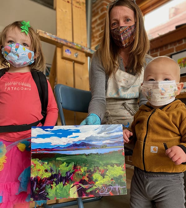 Her thoughtful son Brinkley asked me to create a custom painting for her of Russell Lakes, one of her favorite green spaces in Colorado. We even got the tiny grandkids involved and they each got to make a little green mark on the painting. The collaboration was so fun and it stuck with me because I’ve caught myself avoiding greens on my palette. So these days I’m giving green another try. There are new spring paintings in the studio and the door is open to visitors most days. Be sure to check out Carolyn’s art on her website and her show with her son Brink Messick this summer at Pinon. Below are some of her magical hand stitched works..