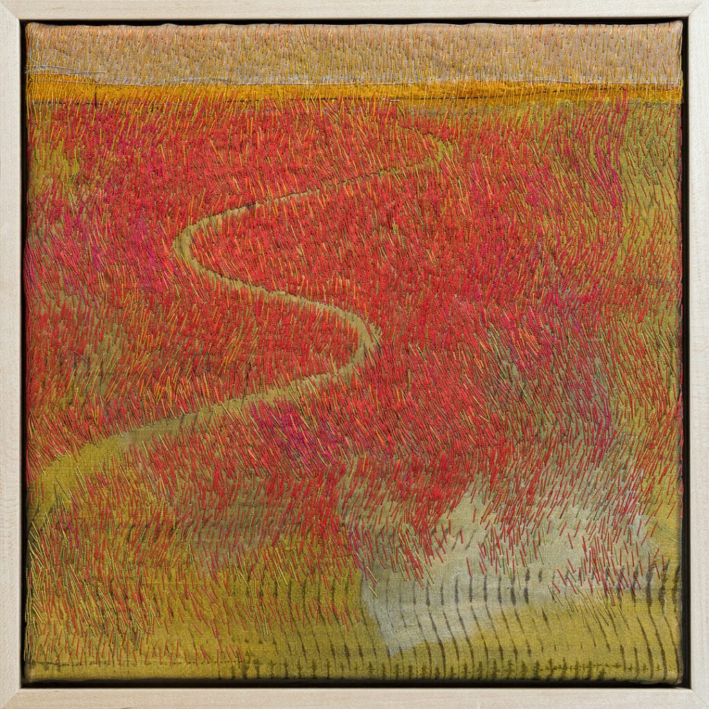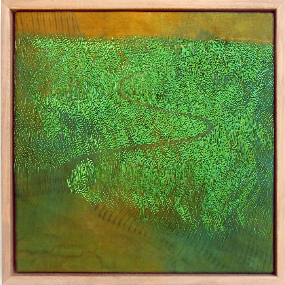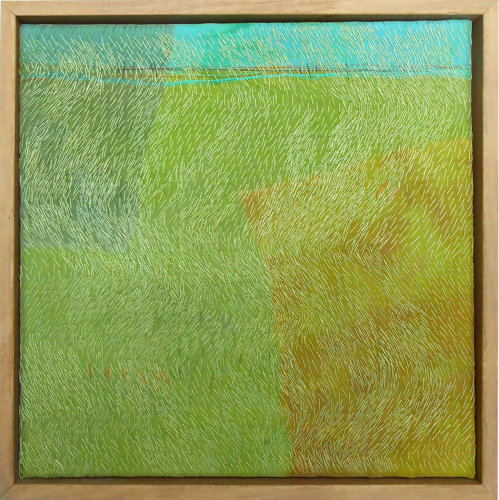 While walking to my studio recently in the rainy spring air, I noticed tiny shoots of green beginning to emerge. The air smelled fresh and new, the way only spring air does. I thought about my artist friend Carolyn Nelson, who recently said, “I miss the color green.” Having moved to Colorado from North Carolina, she’s used to the lush landscapes that continue to inform her work. Her hand-stitched fabric art is filled with the colors and rhythms of grasses blowing in the wind. It reminds me of drives across the eastern plains, and moving with the wind as it blows through grassy fields like a wild living thing.