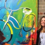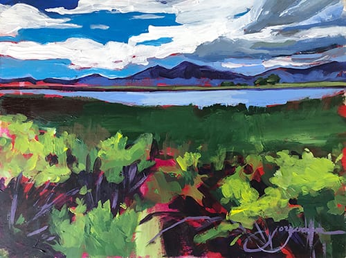 Her thoughtful son Brinkley asked me to create a custom painting for her of Russell Lakes, one of her favorite green spaces in Colorado. We even got the tiny grandkids involved and they each got to make a little green mark on the painting. The collaboration was so fun and it stuck with me because I’ve caught myself avoiding greens on my palette. So these days I’m giving green another try. There are new spring paintings in the studio and the door is open to visitors most days. Be sure to check out Carolyn’s art on her website and her show with her son Brink Messick this summer at Pinon. Below are some of her magical hand stitched works..