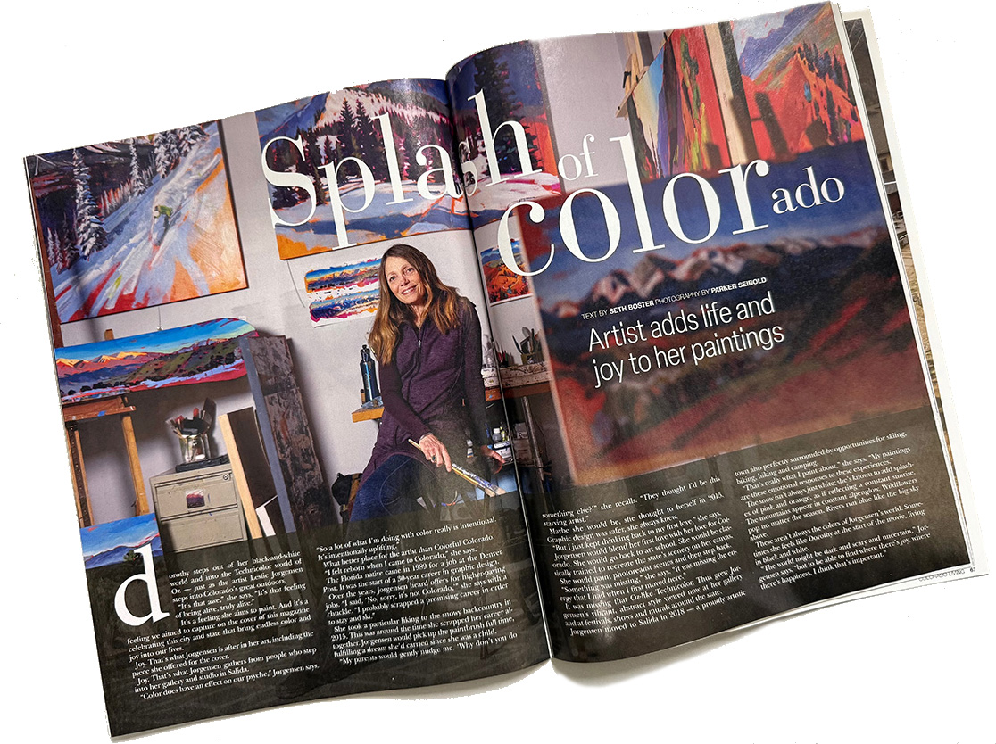 Special thanks to the Gazette’s creative director for her design work, to the writer and editors for working their magic and to the talented photojournalist who visited me at my gallery. You can pick up a free copy at my studio gallery in Salida while supplies last (I have a stack) or view this issue online HERE.