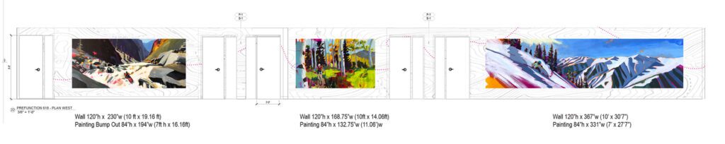 Jorgensen’s four adventure paintings will be reproduced as wall murals that range from 11ft to 28ft wide. Behind each painting will be a topo map design. A red dotted trail line will run through them to suggest a journey and visually create a connection between the paintings.